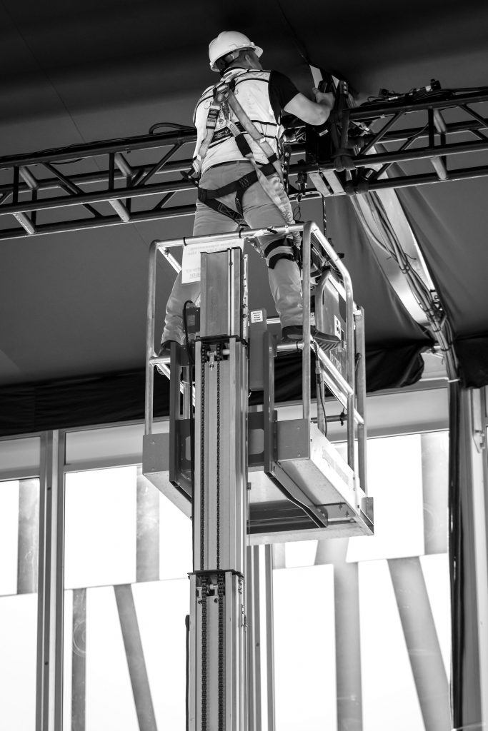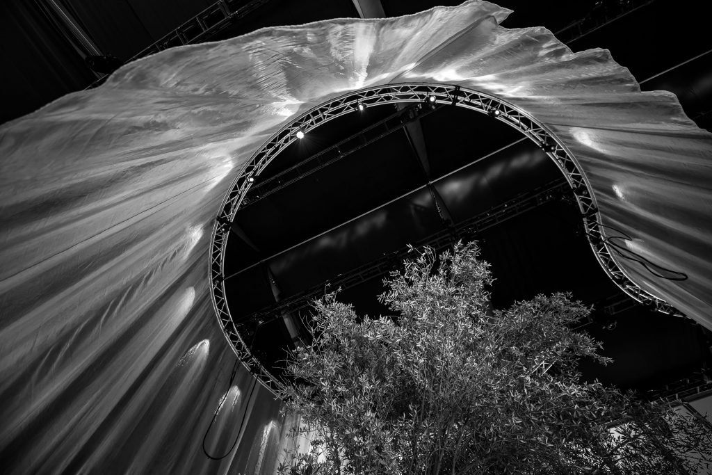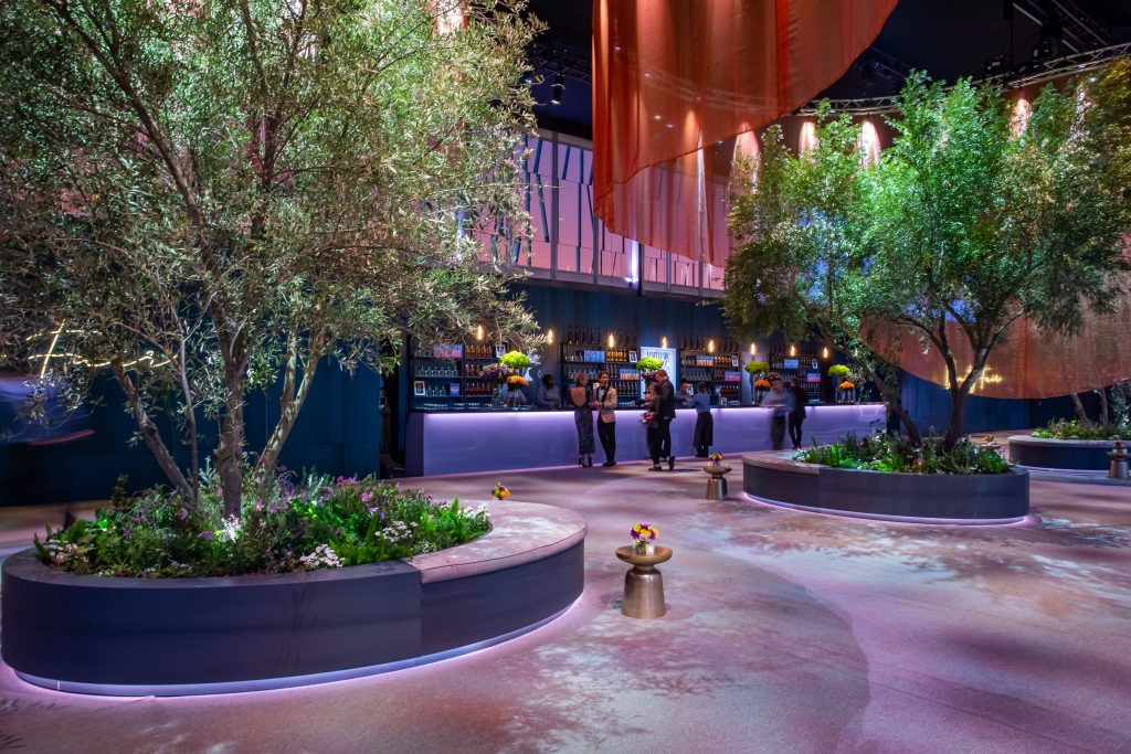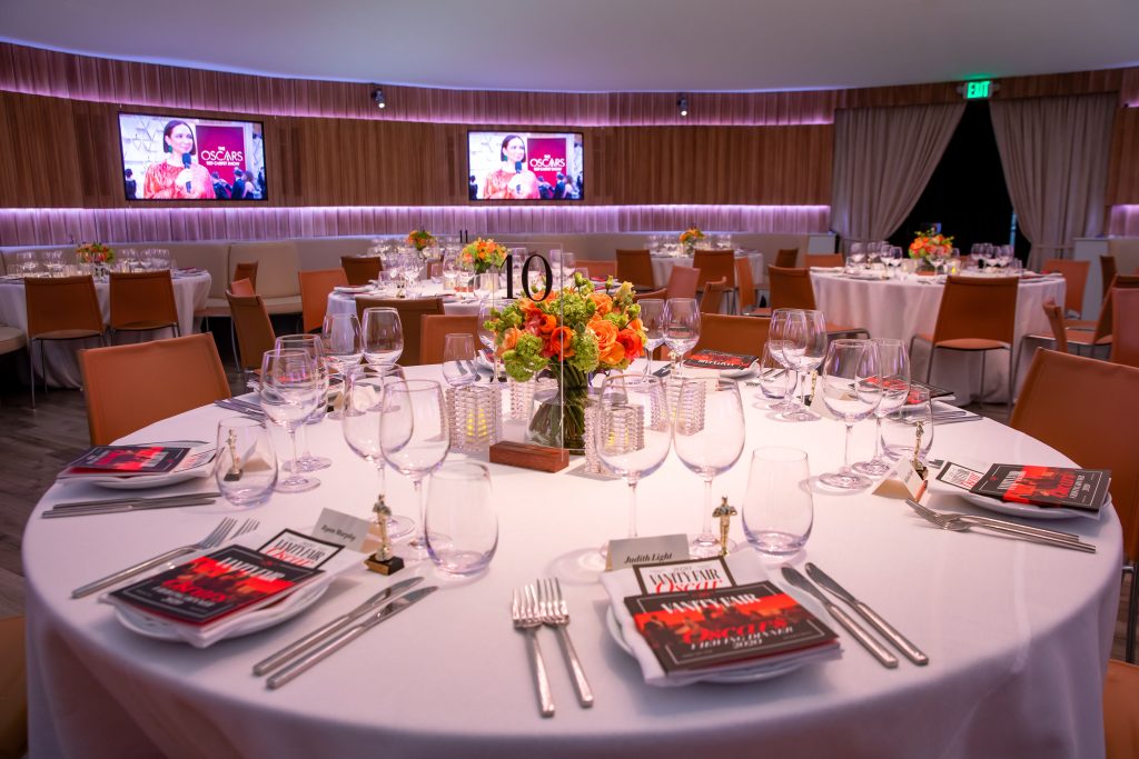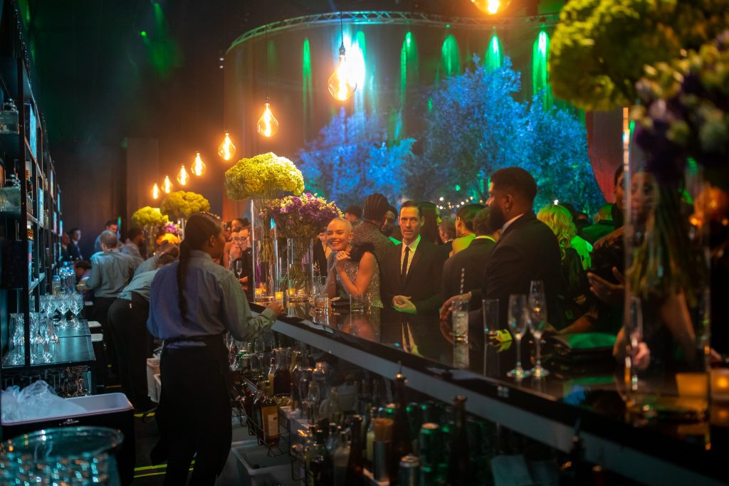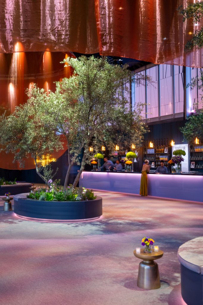 After leaving the red carpet, guests enter a 7,000 sq.ft. party pavilion. The glass pavilion features a 30-foot high glass wall facing the historic backdrop of the Beverly Hills City Hall. Four large olive trees anchor the interior of the pavilion along with benches that create an ‘Indoor Park.’ Overhead, fabric hanging panels wind around the trees and are illuminated in a variety of colors throughout the evening. The graphics on the back of the bar incorporate all the award categories and nominees as well as large scale black and white images of nominees.