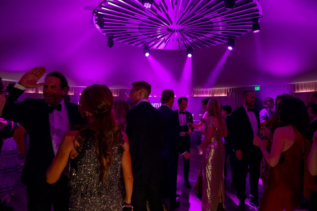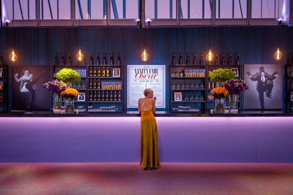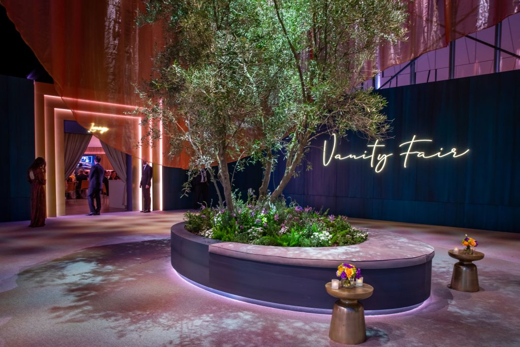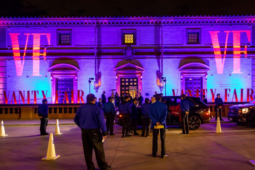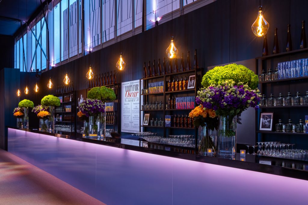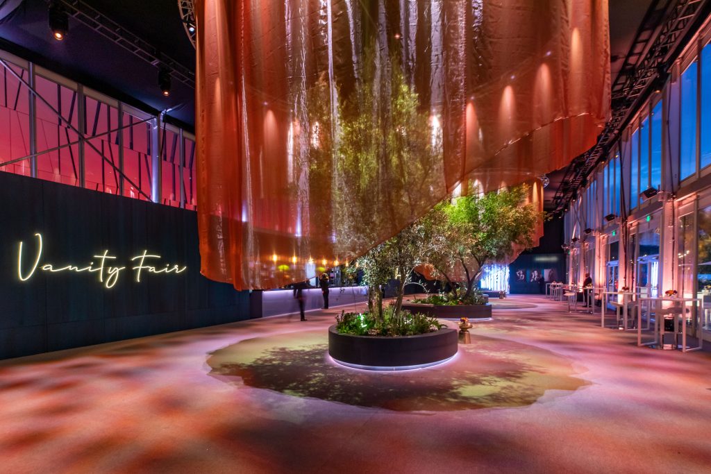 2020 was BWA’s 21st year of designing and producing the Vanity Fair Oscar Party. The event was again held at the Wallis Annenberg Center for the Performing Arts as well as the Beverly Hills City Hall Plaza. Guests entered through the main entrance of the Wallis Annenberg Center and were directed through a corridor of floor to ceiling backlight images by Ethan James Green. A 100-foot-long red carpet serves as the press and paparazzi area with a custom fabricated backdrop. Illuminated, deep blue stained wood panels with 8’ foot high three dimensional letters create the backdrop to the red carpet.