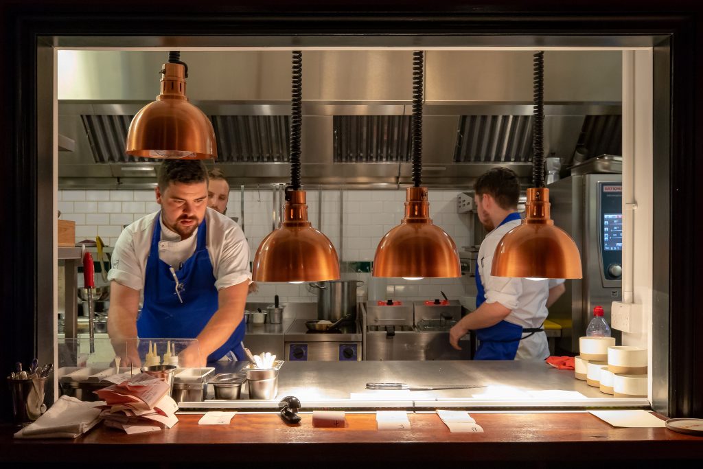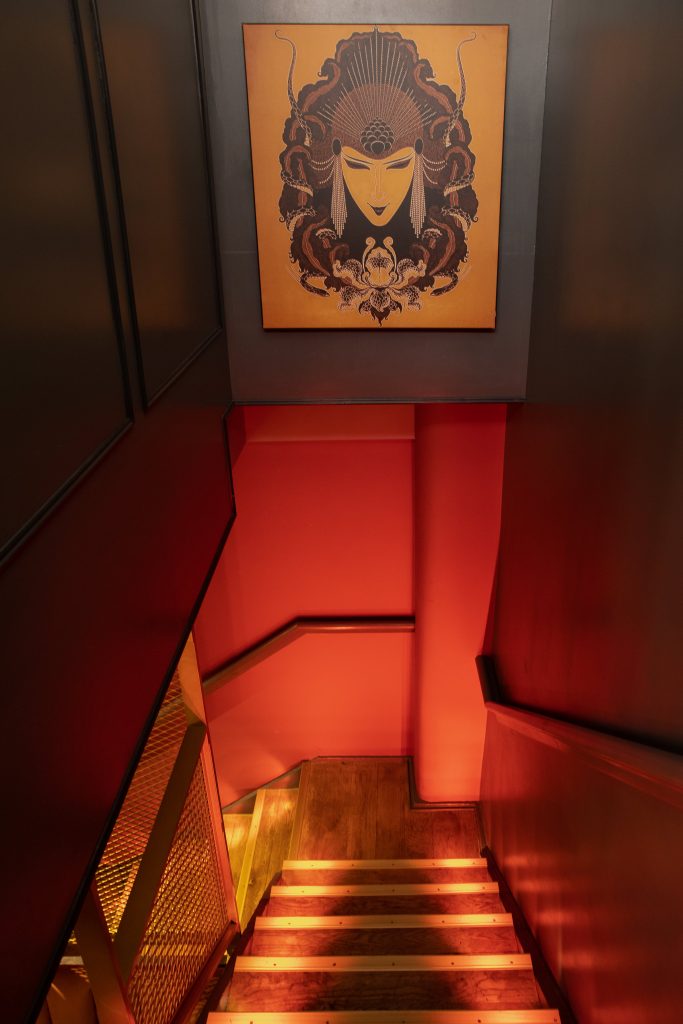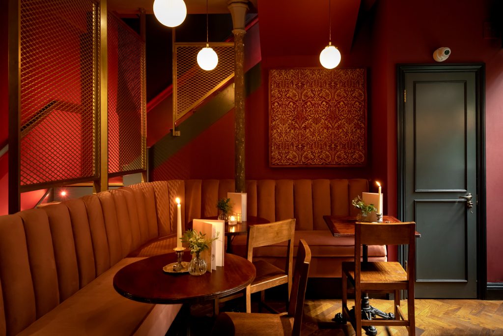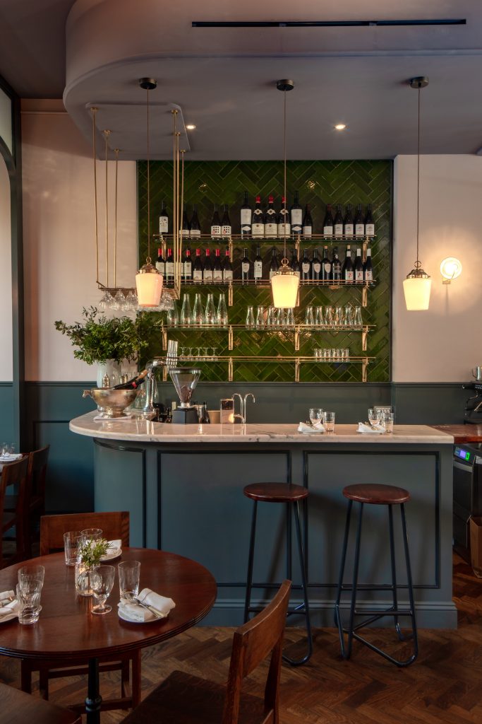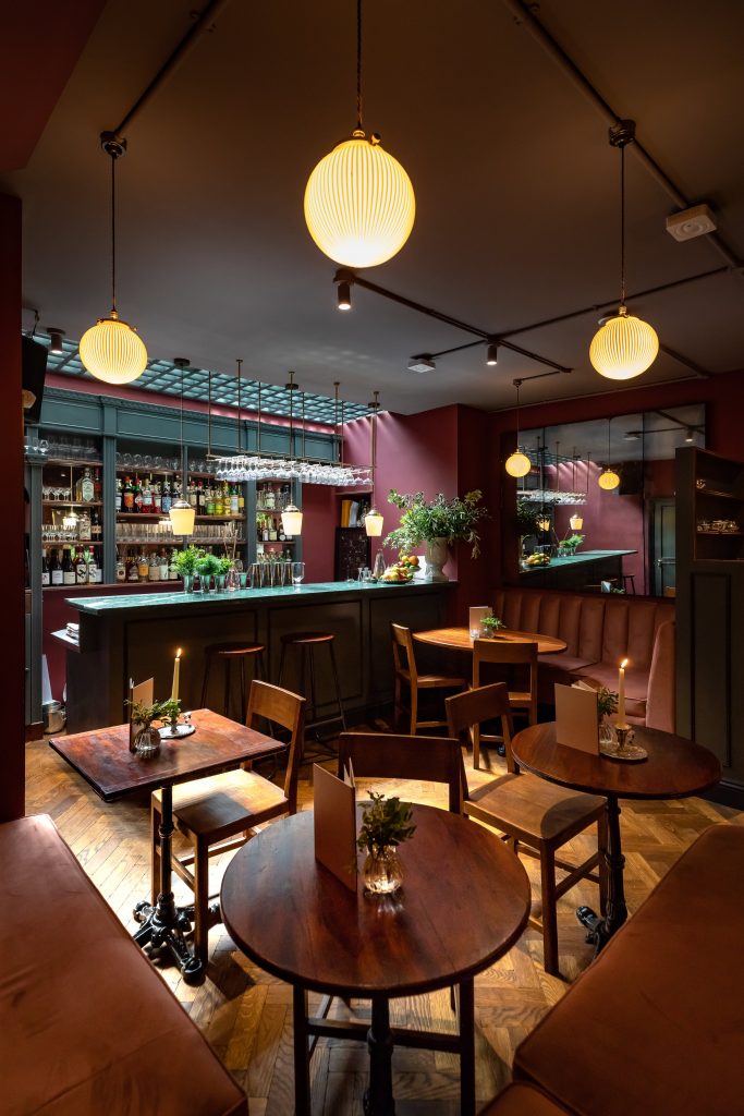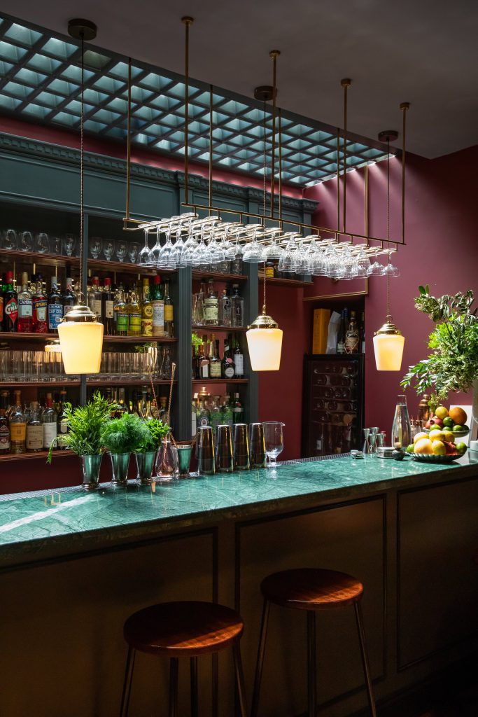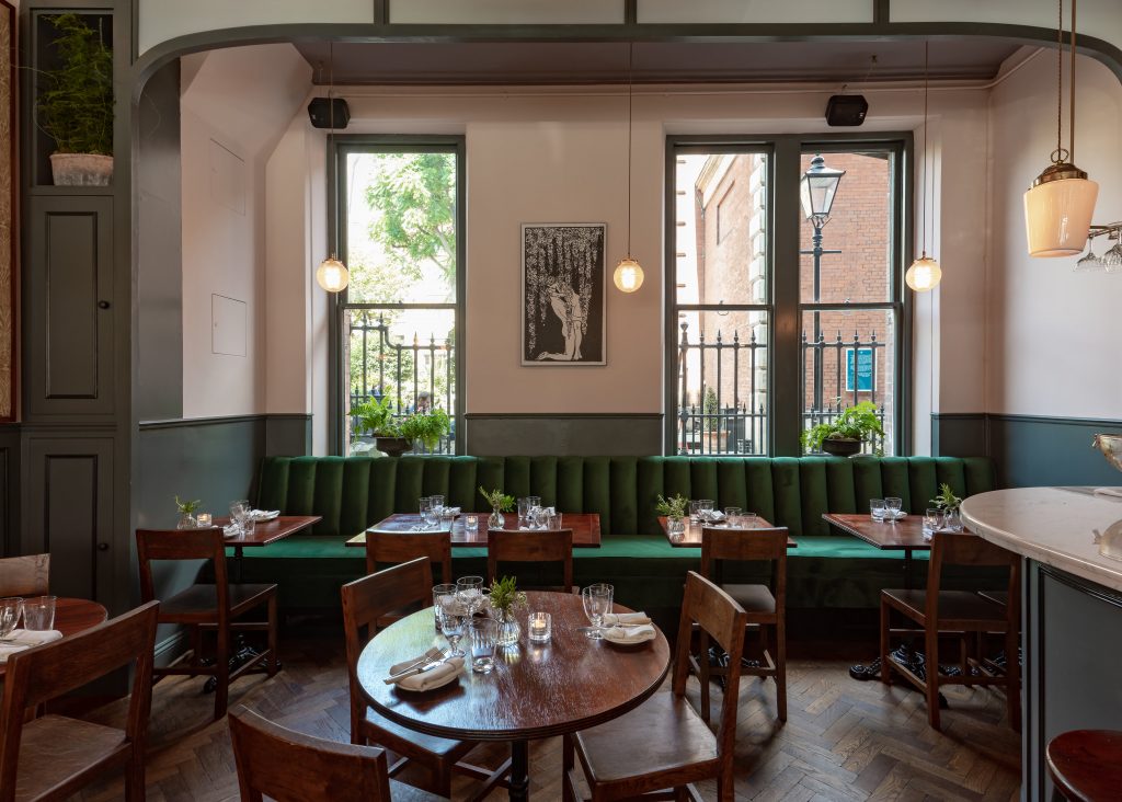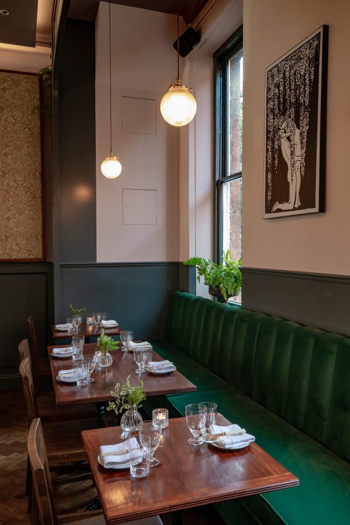 making people delighted and inspired. High-ceiling and a parquet-floored upstairs dining room are mirrored in reverse in the bar downstairs. The intimate hallmarks of Cora Pearl are glossy, velvety, with emerald deep-green tiles, leather banquettes, antique mirror panels, with Aubrey Beardsley photo prints, and a bold caged iron staircase adding to the overall vintage ambiance of opulence.