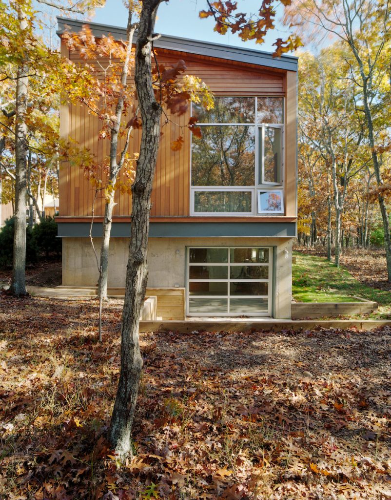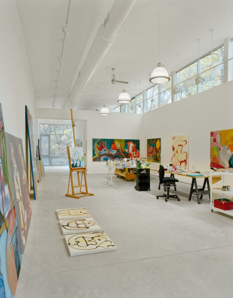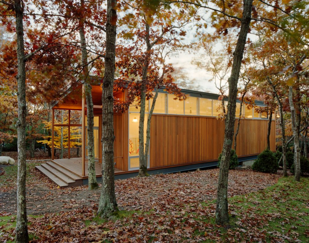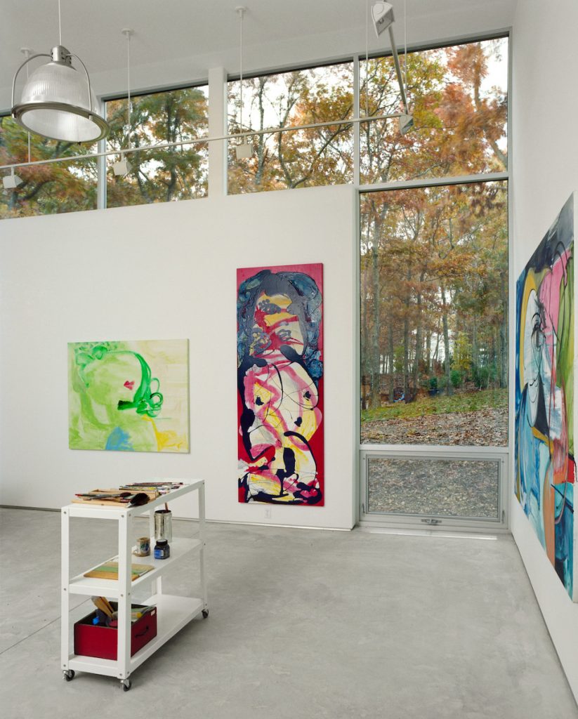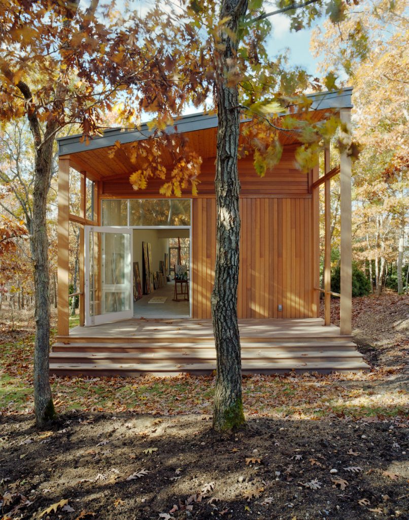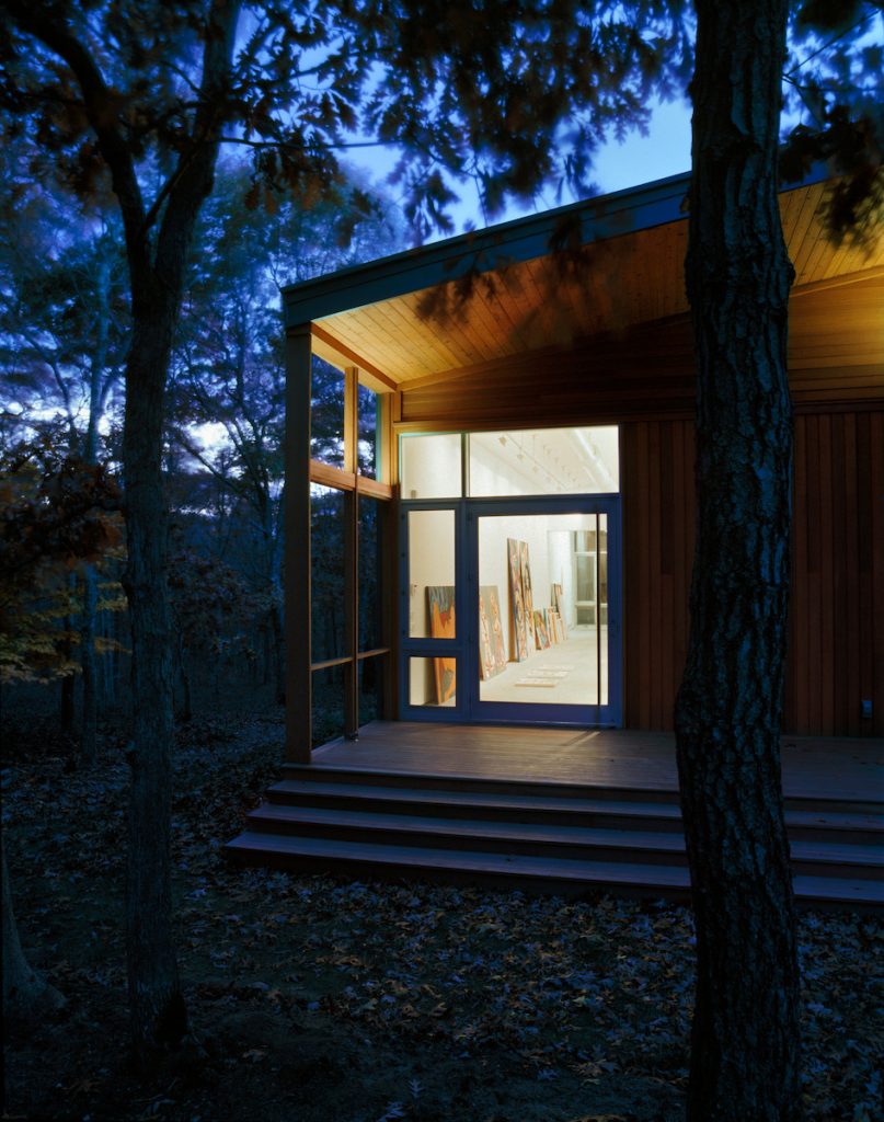 The exterior walls, clad in a natural cedar siding, are punctuated by clerestory windows that wash the studioʼs large interior space with a diffused northern light. A zinc-coated metal roof wraps around the southern end of the rectangular structure, shielding it from direct sunlight. When daylight begins to fade, inside activity is revealed as the interior begins to glow, and gently illuminate the surrounding landscape.