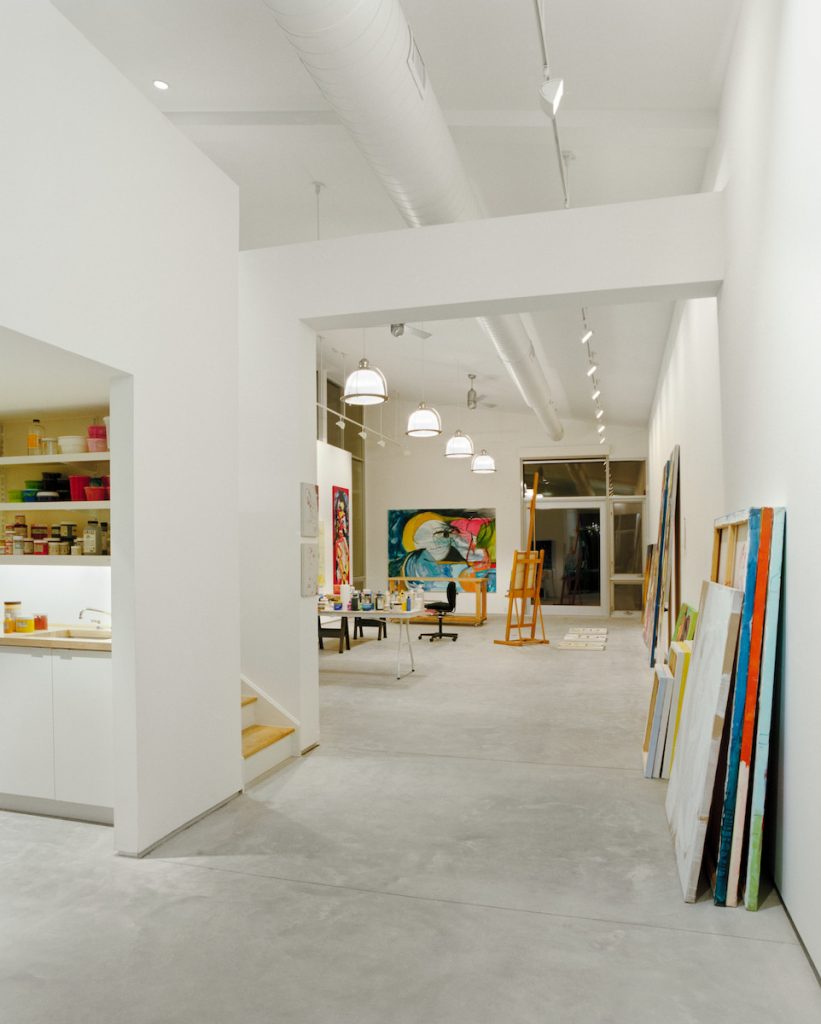 This light-filled artist studio is conceived as a simple rectangular box which rests lightly on a 1.5 acre East Hampton site. Lifted off the ground by concrete piers, the building allows the natural contours of the land to continue below it. In some places, the siteʼs natural slope reveals the studioʼs cast-in-place concrete walls.