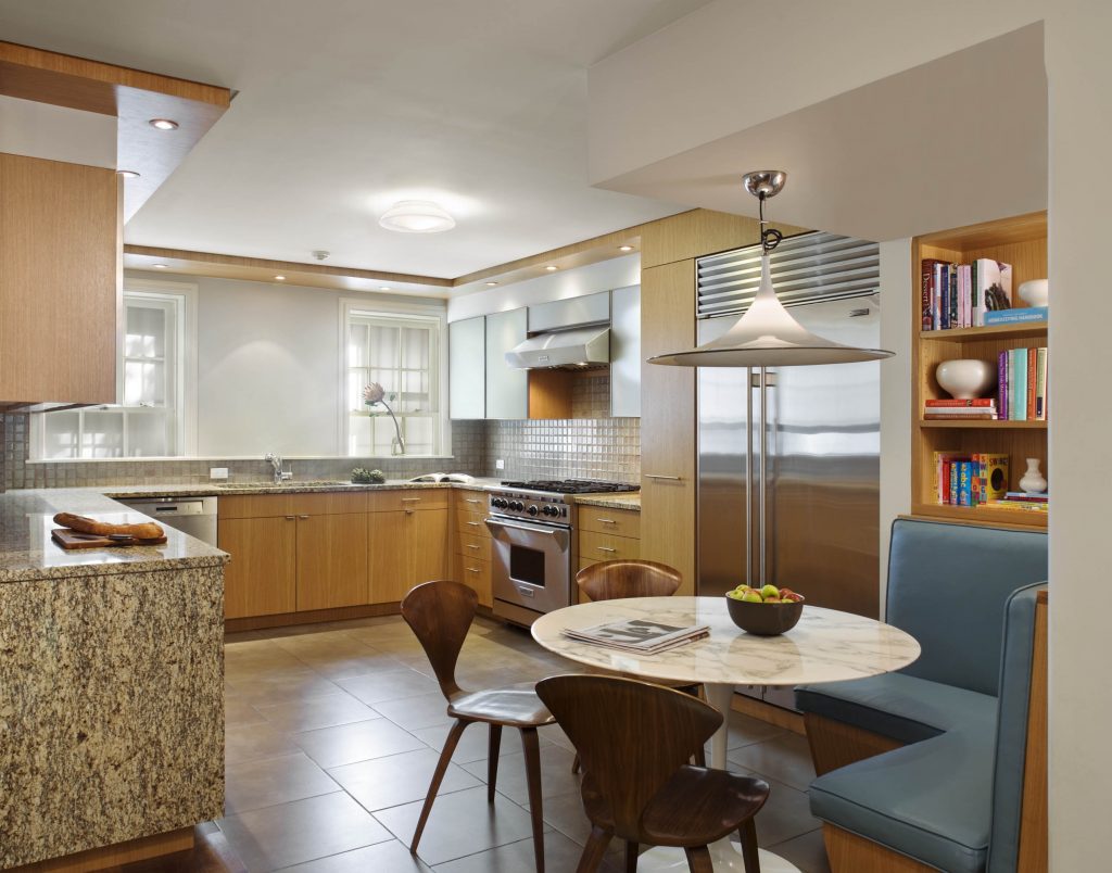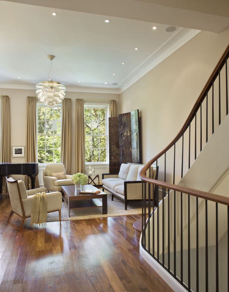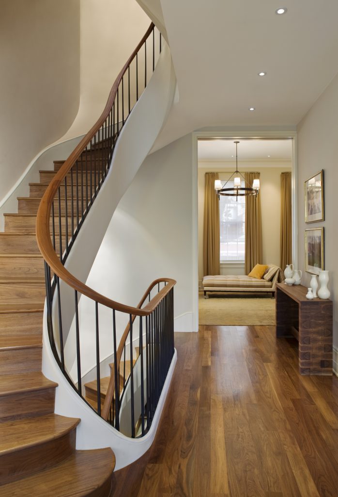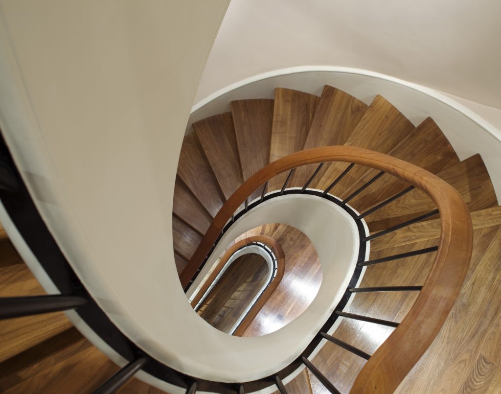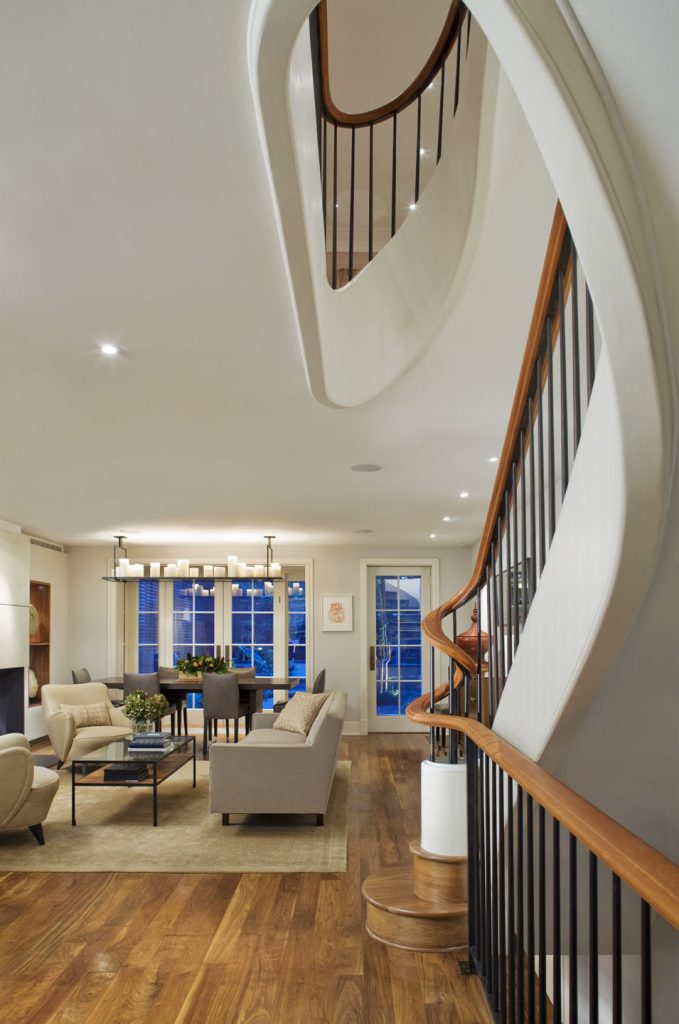 The nautilus-like spiral of the walnut wood staircase together with an elegant interior design have shaped contemporary spaces that are open yet private and suggest an environment of sophisticated domesticity.