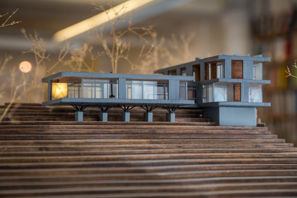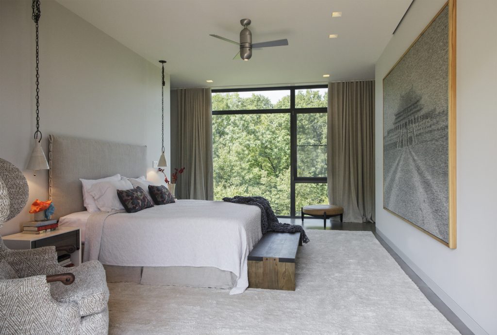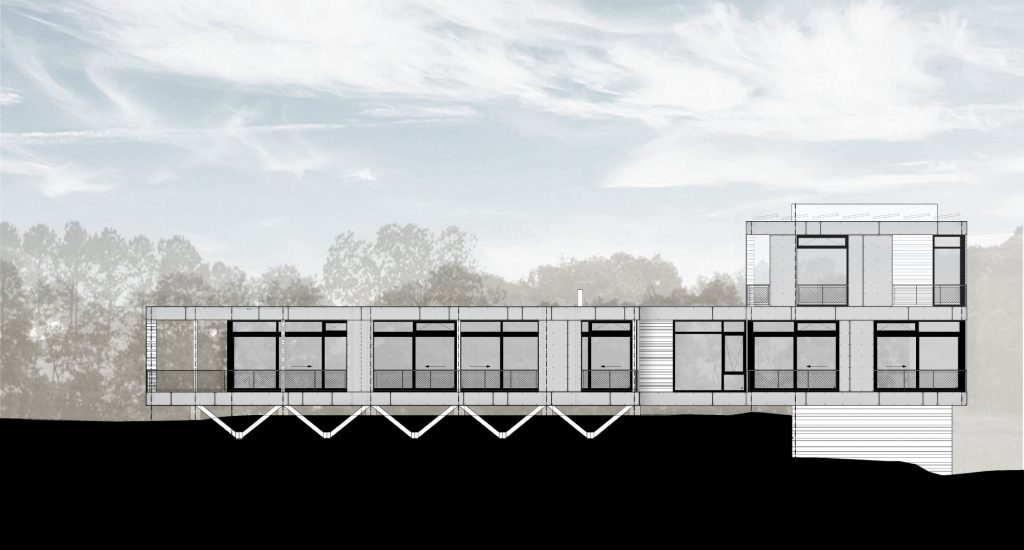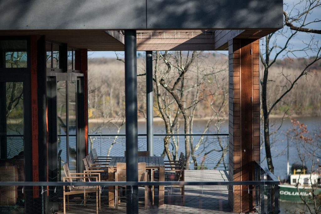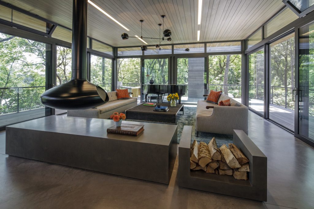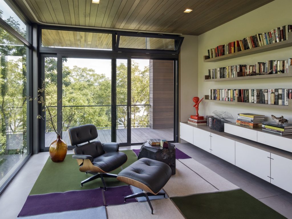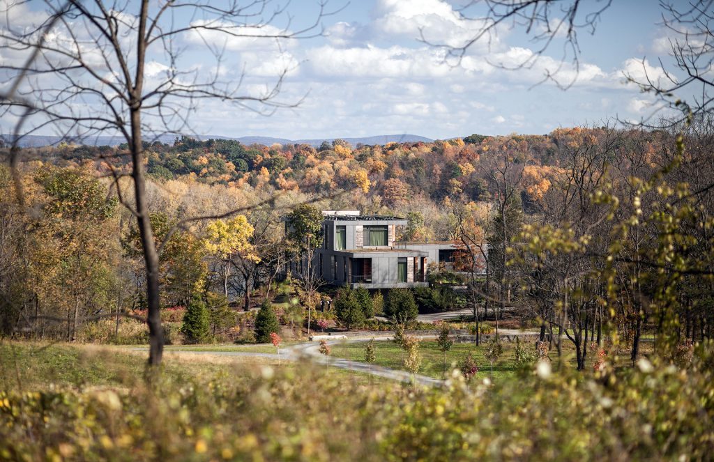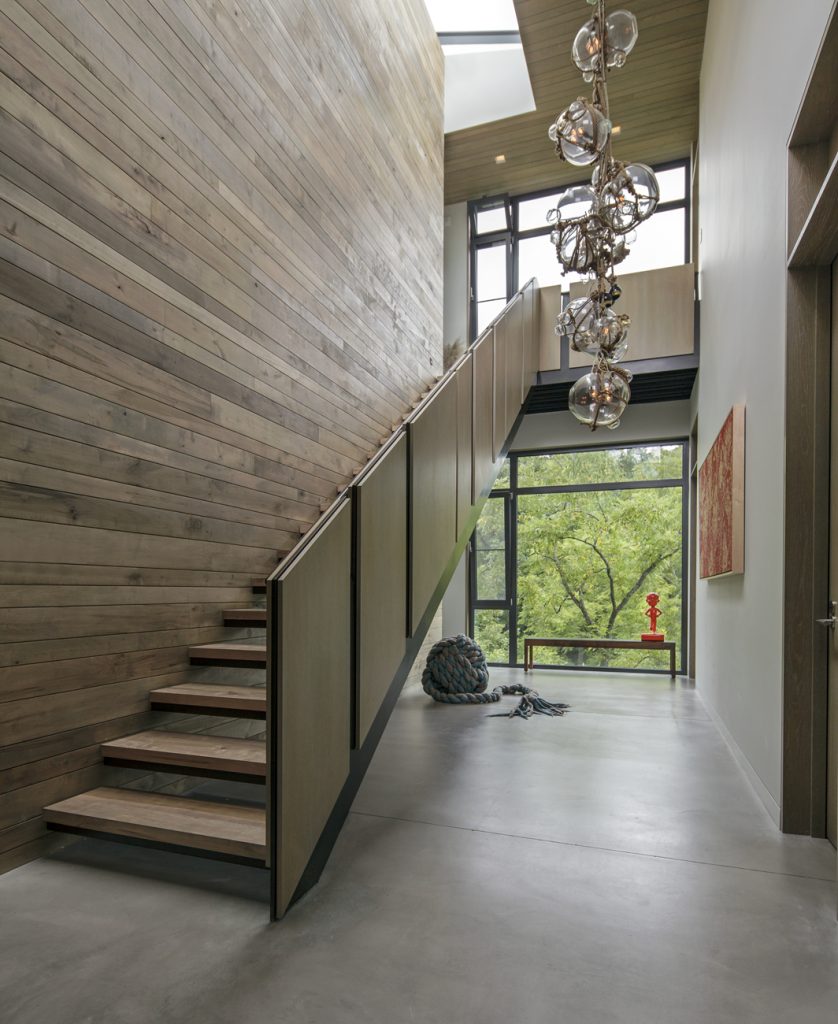commanding views of the river while permitting the landscape to flow under the house and provide space for seven geothermal wells which serve the radiant cooling and heating for the home.