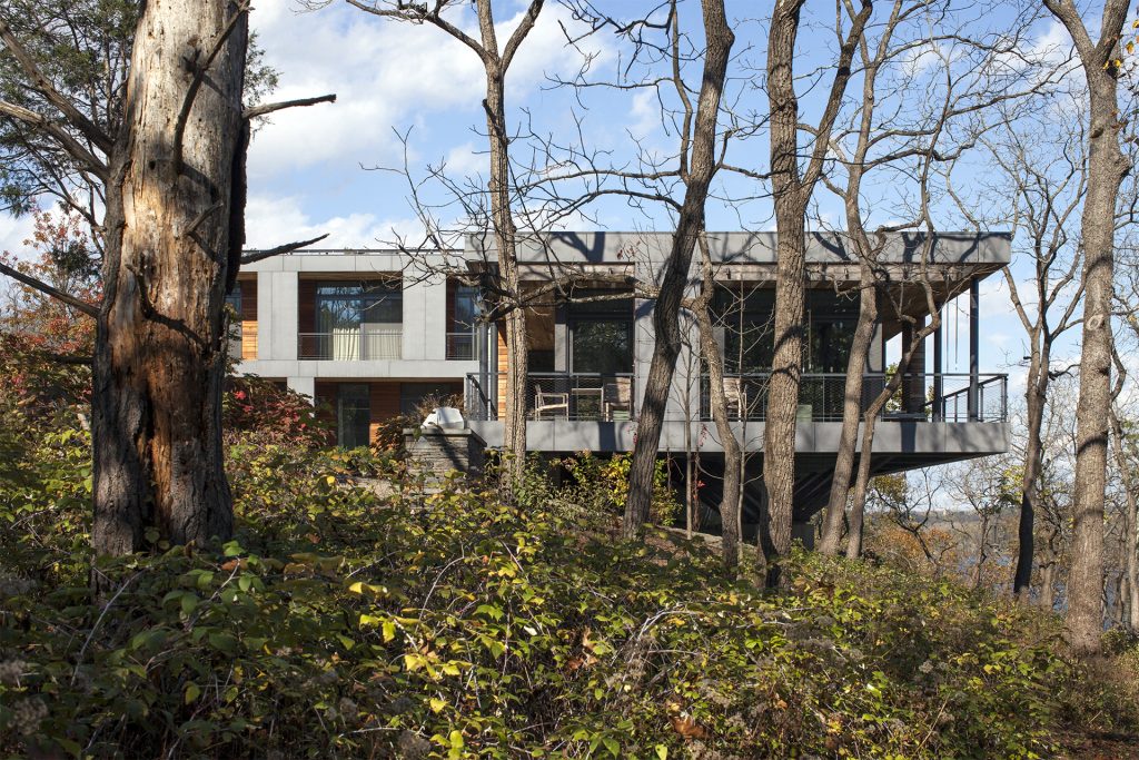 This river-front home is placed along the top of a sharply sloped shale river bank ridge, with the surrounding woods providing design inspiration. Like a walk in the woods, the house and landscape conceal the river views beyond it. Only by entering the home is the full drama of the surroundings revealed.