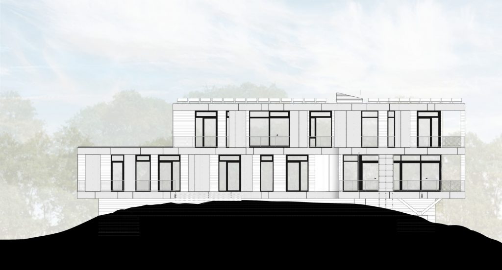 Deep exterior decks provide relief from the summer sun while in the winter permitting warm sunlight into the interior. The exterior rain screen consisting of reclaimed wood and concrete panels are layered to reveal floor-to-ceiling windows providing natural light to the interiors, minimizing the demands on interior lighting. The house is capped with solar panels while the lower roofs are planted with native species minimizing storm water runoff and linking the home back to the natural landscape.